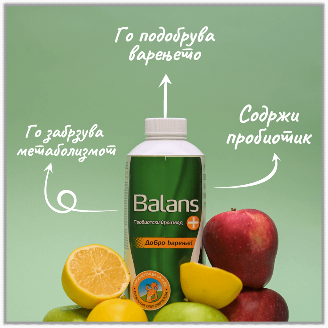 Јогуртот Баланс+ е пробиотски јогурт за кој е докажано дека го подобрува варењето, а индиректно – целокупното здравје. Тој е единствениот пробиотски јогурт на домашниот пазар за кој со клиничко тестирање е докажано дека позитивно влијае на неколку аспекти на варењето, по само 10 дена редовно консумирање. За подобро варење доволно е да пиете 500g Баланс+ јогурт дневно – шолја наутро и шолја навечер.