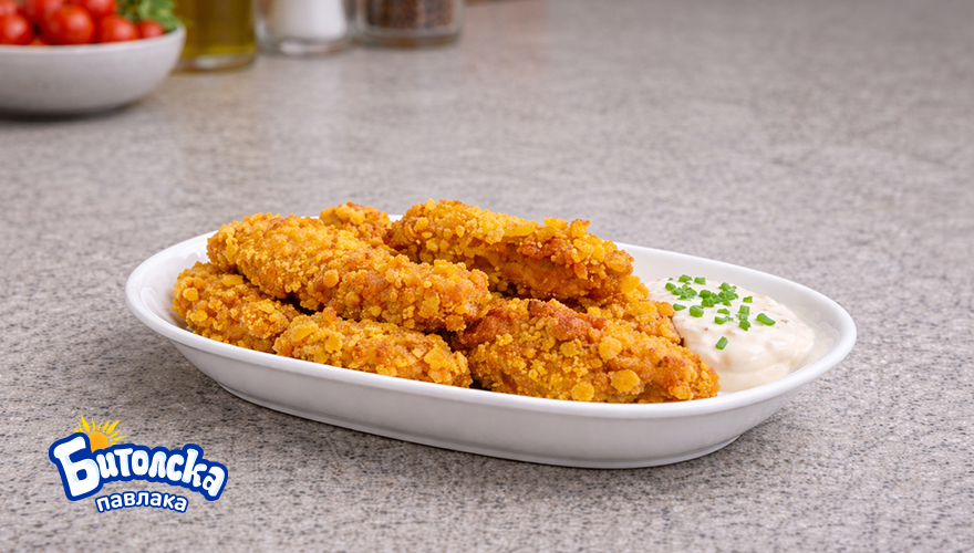 Bалкајте ги парчињата стекови по следниов редослед: прво во сад со изматени јајца, потоа во брашно, на крај во сад со корнфлекс.