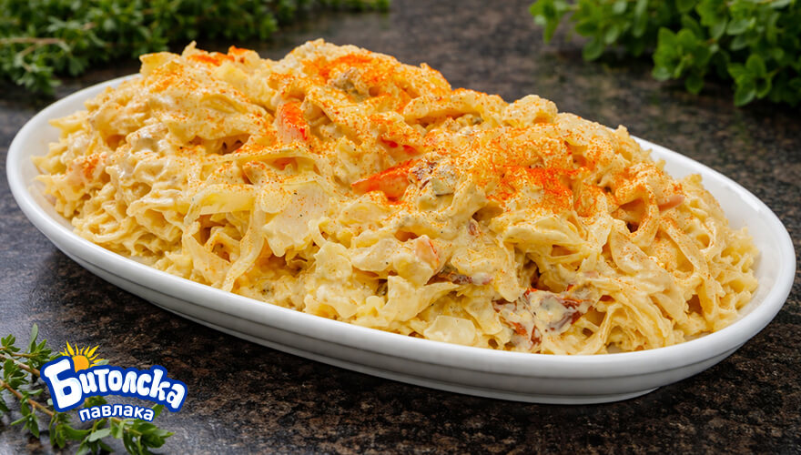 Во веќе измешаната смеса од винегрет, црвена пиперка и сушени домати, додадете три супени лажици Битолска кисела павлака. Свежината на павлаката ќе го заокружи вкусот на сите состојки и ќе даде дополнителна кремавост на салатата. Мешајте додека не се соединат сите состојки и добиете мазна кремава структура.